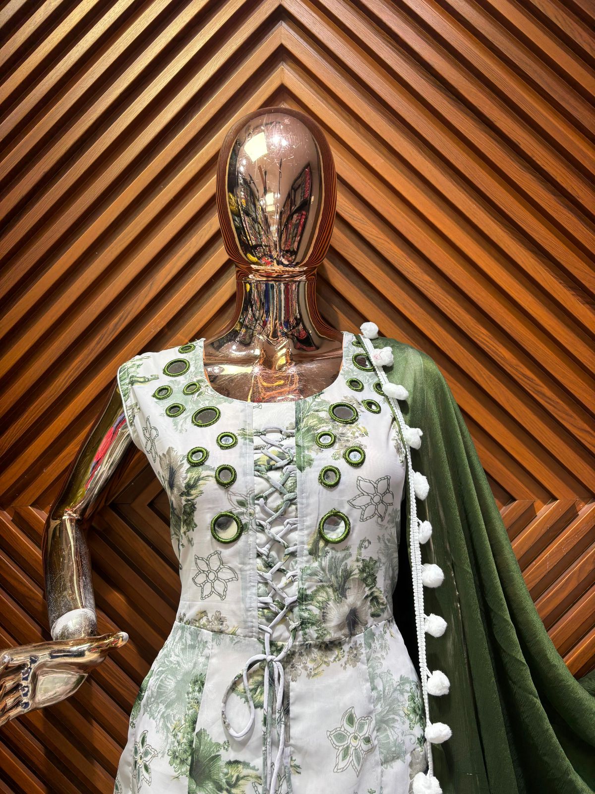 ā Kurta: White base with elegant green floral prints, enhanced with mirror-style embellishments, lace-up neckline with tassel tie-ups, and playful pom-pom lace finishing.
